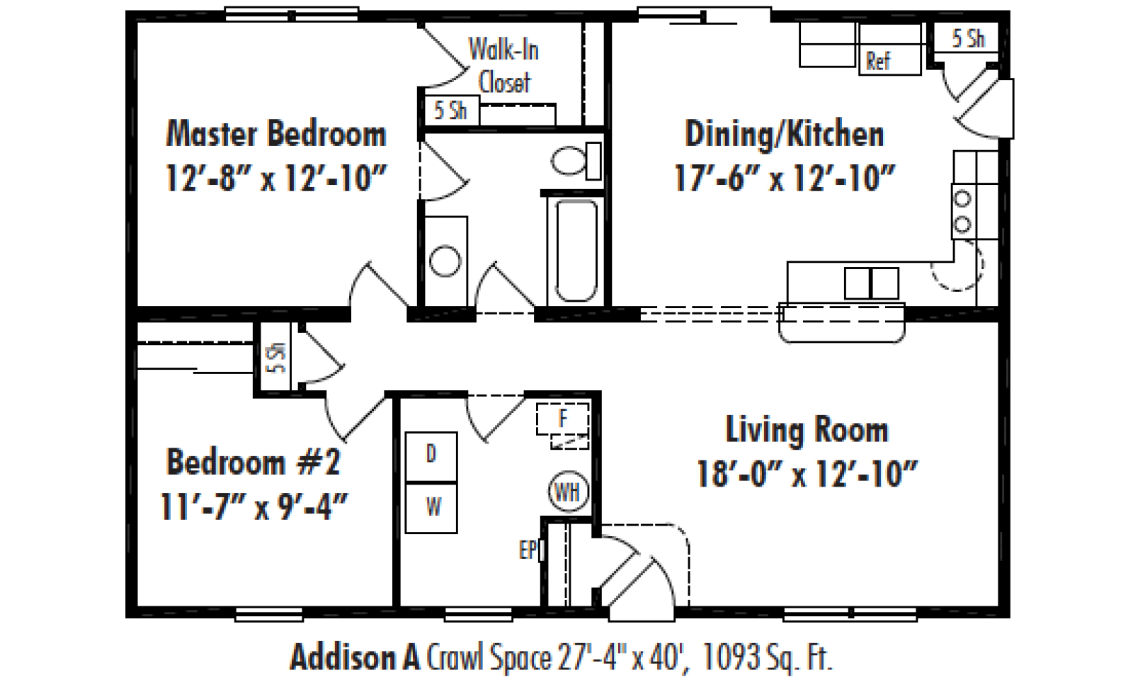 This model features two bedrooms including a master bedroom, as well as a standard of one bathroom with the option of including a second master bath. Standing at a total of 1,093 square feet, additional customization options for this model include a garage and a basement level.